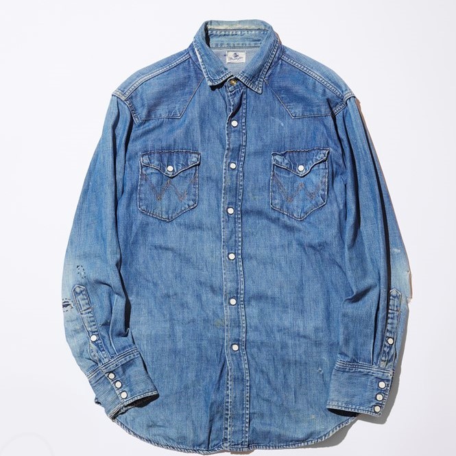 ラングラーを代表するアイテムのひとつであるデニムのウエスタンシャツ。通称イチゴボタンと呼ばれるサードモデル。