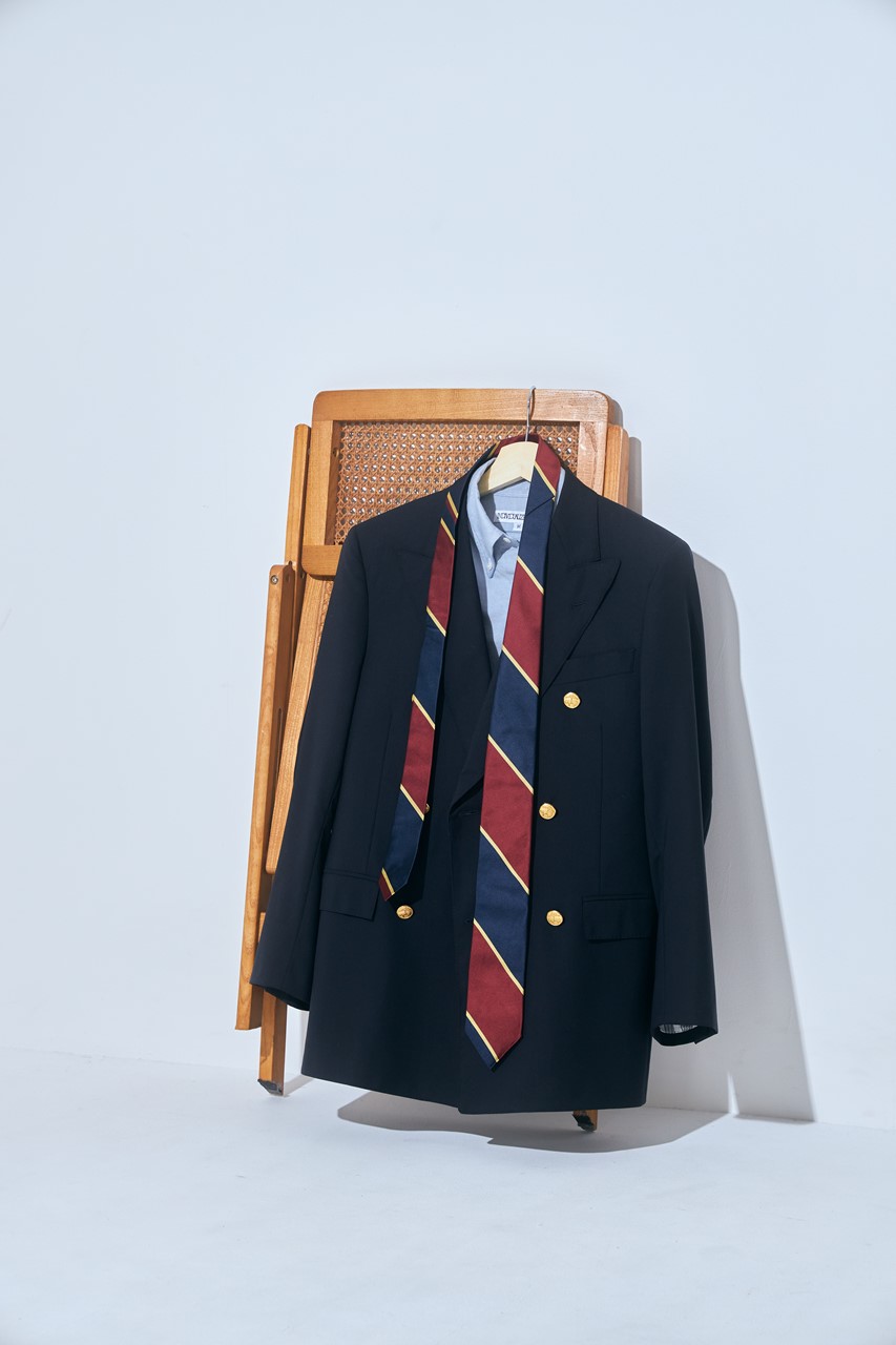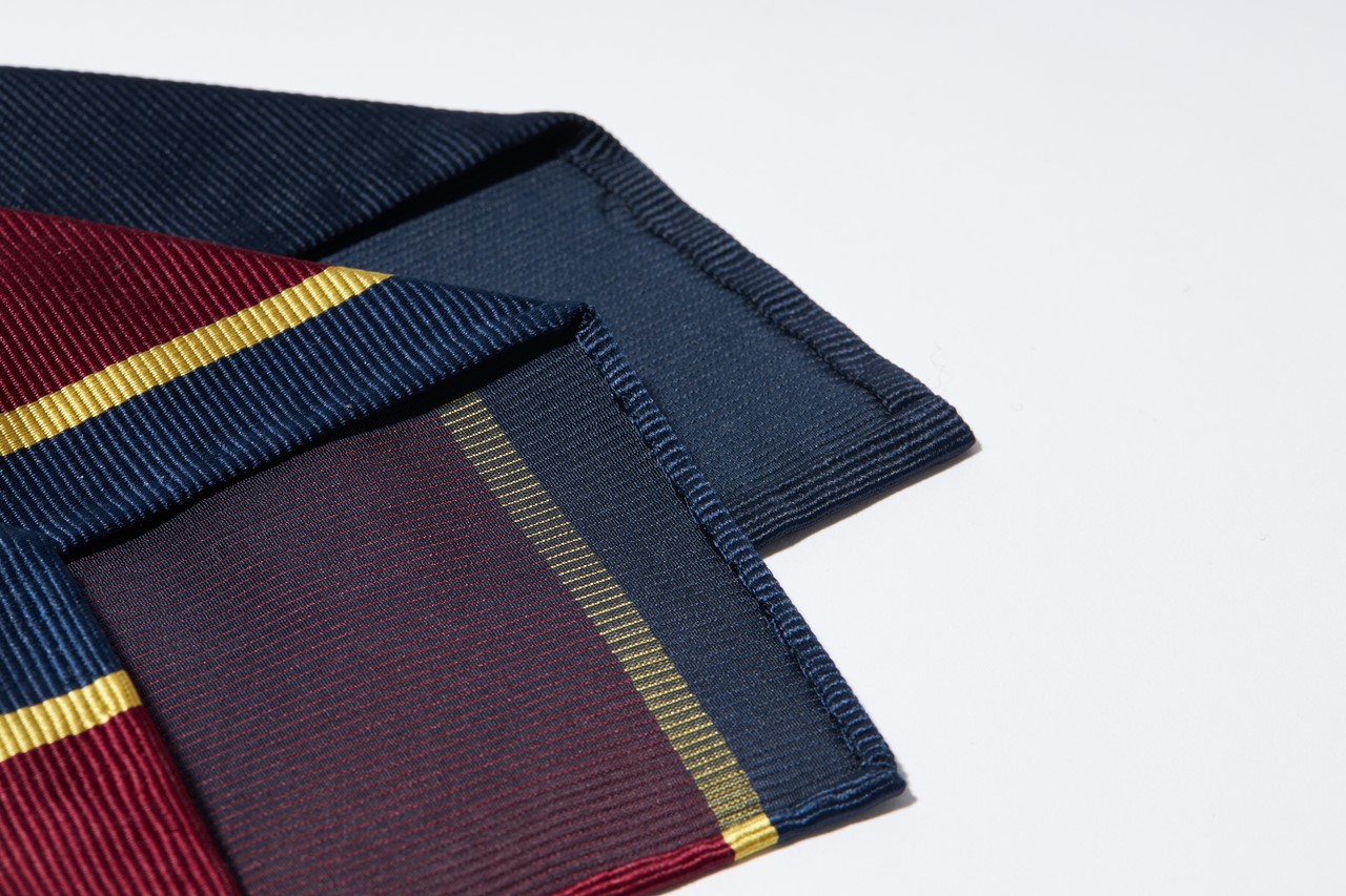 大柄なレジメンタルをトラッド直球の配色で別注。熱や水を加えてローラーをかける「整理」という工程を行わないことでシルクの生地感を最大限に生かし、裏地を使わないことでスカーフのような軽やかさとカジュアルさを兼備。