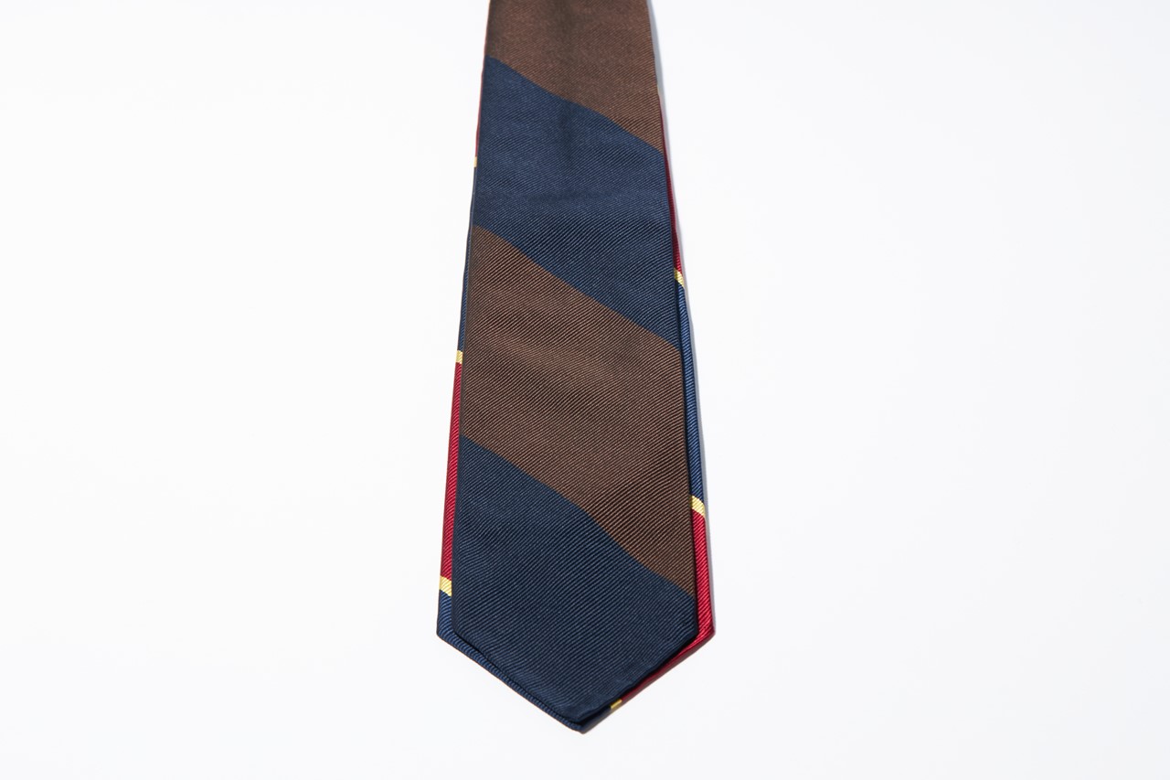 ドレスとカジュアルを横断しつつ、アメリカントラッドの文脈からも逸脱しない配色、なおかつ天邪鬼な洒落心をもくすぐる大柄なレジメンタル。一見しただけでは気づけない細部への執着と、シルクの素材感を生かした「未整理」の生地感に至れば、もはや自己満足。そこに浸れる常人ならざる「着道楽」こそが身につけるタイ。