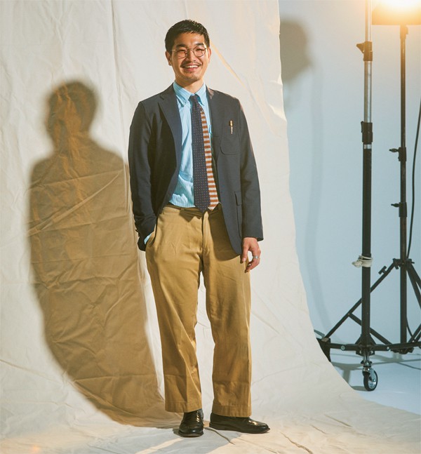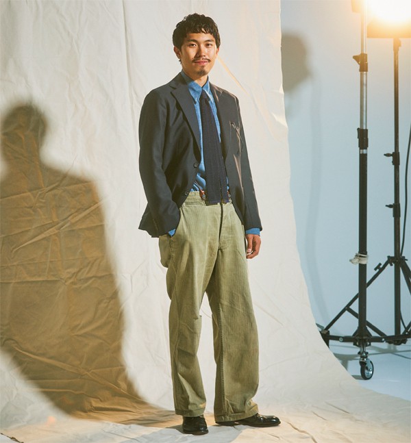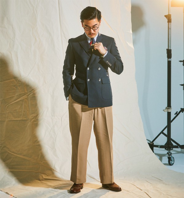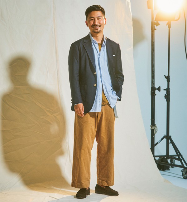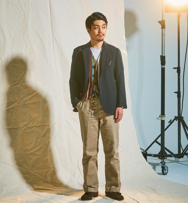ワイルド ライフ テーラー 恵比寿で働く宍戸佑輔さん(28)は、学生時代に留学先だったニューヨークでは本場のトラッドショップに感激しこの世界へ足を踏み入れた。「ブレザーはあくまでブルゾン感覚。伝統的なディテールは自然とそんな着方にハマるんです。インナーのTシャツは白だとつまらないので、カーキカラーを。これは『アニーホール』のウディ・アレンがお手本ですね」