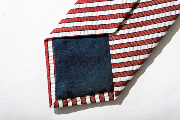 タイは通常、1枚の生地から斜めに切り取った3枚の布で構成されている。それぞれ、大剣(太い方の剣先)、小剣(細い方の剣先)、中継ぎ(首周り部分)と呼ばれる。ノットは結び目(写真下)で、ディンプルはノットの下のくぼみ。ループは小剣を通してタイを安定させ、バータックは芯地を固定するためのステッチ。