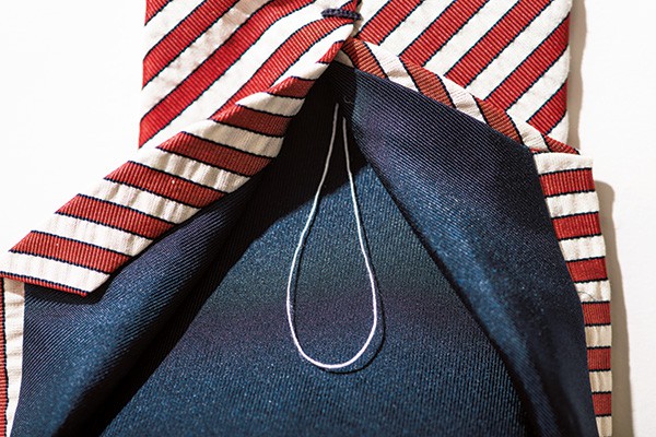 3 )タイは結ぶたびに生地に負荷がかかる。それを軽減するのが、縫いに遊びを生む糸。たるみ糸とも呼ばれ、ハンドメイドの象徴だ