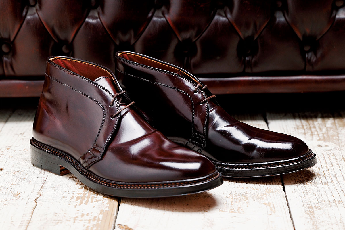 英国ブランドによるブラウンスウェードのチャッカブーツも確かに素晴らしい。洒脱にして男の色気を感じさせる。しかしながら、バーガンディカラーのコードバンにダブルレザーソールを配した、このチャッカブーツはどうだろう。群を抜いて男らしい。スラックスだって、ベイカーパンツだって難なくこなす包容力まで見せつける。バリーラストを使用しているので、履くと安心感・安定感で満たされる。