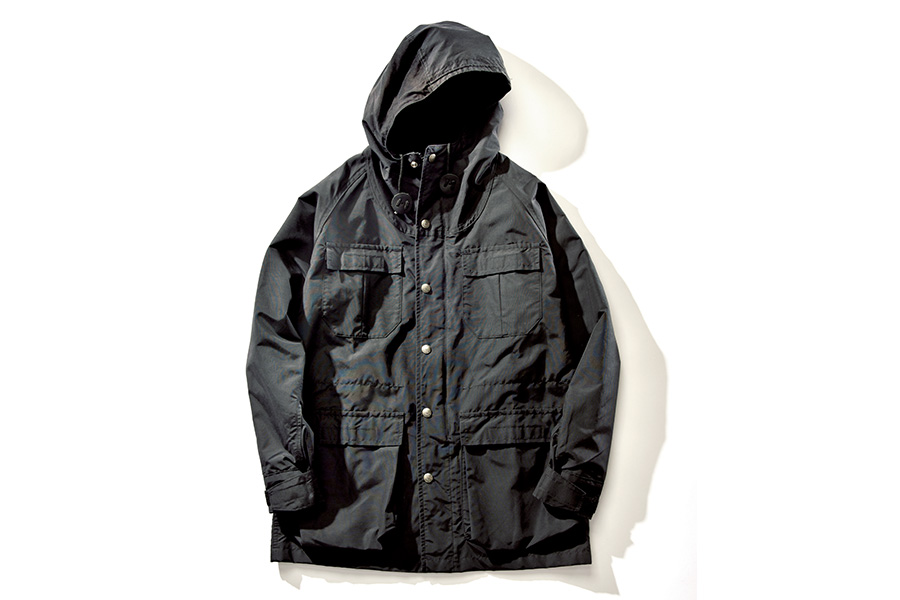 1968年にマウンテンパーカとともに誕生した“60/40クロス”。ヨコ糸にコットン58%、タテ糸にナイロン42% というおよそ60対40 の混紡比率で織られた素材は、通気性と耐摩耗に優れているだけでなく、湿気を吸うとコットンが膨張して水分の侵入を防ぐという画期的なテクノロジーを持った、機能素材の元祖。現在では当時存在しなかったブラックを纏いスタイリッシュさを手に入れた。