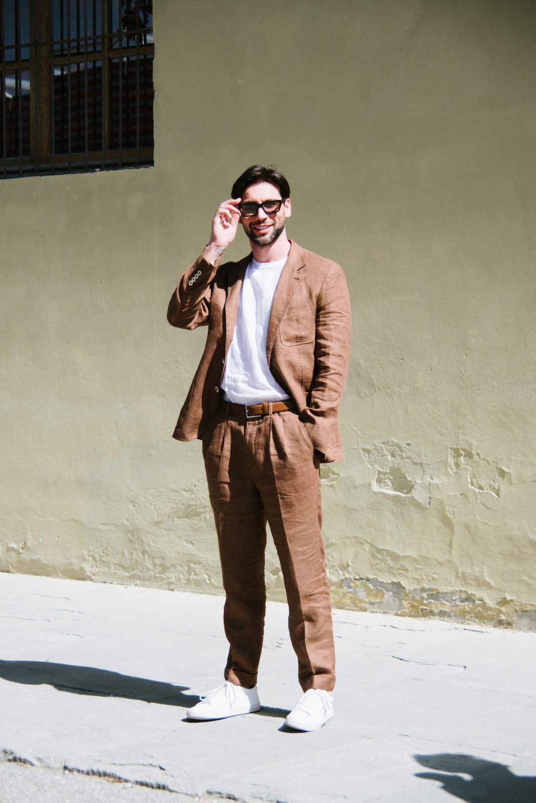 坂田さん:グルカショーツを取り入れた好サンプル。ただちょっとボタンを開けすぎていて、艶っぽい感じが気になります。
