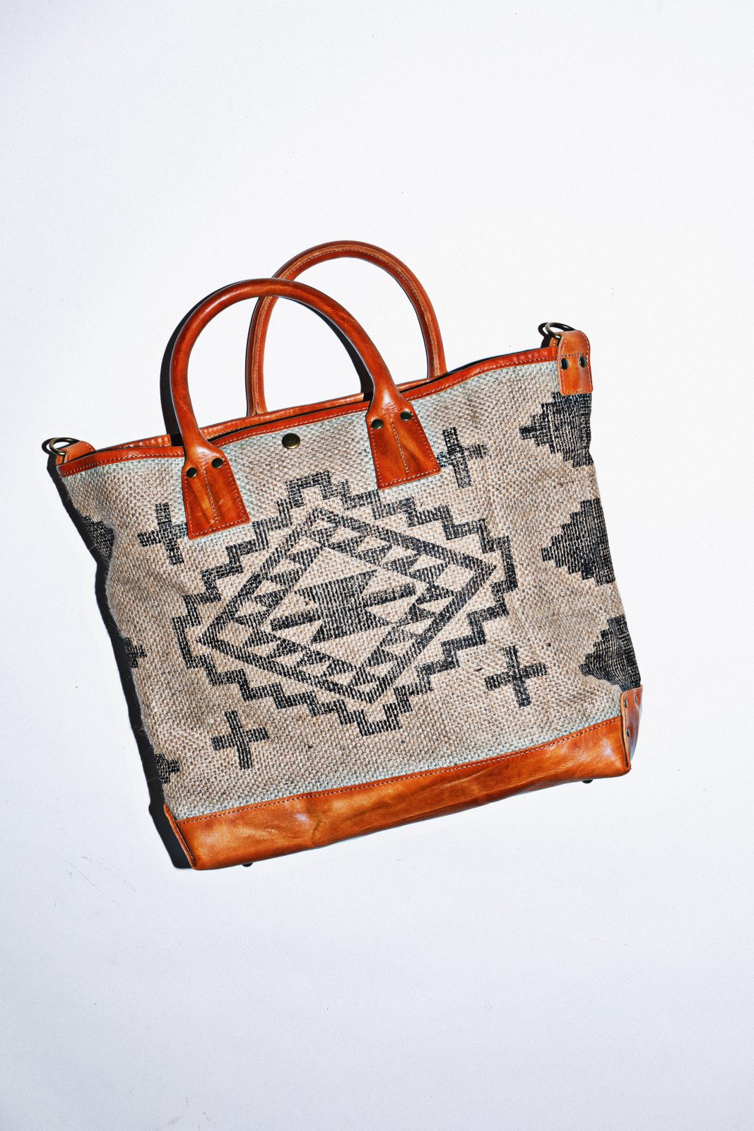 素材に麻を使用したこちらは、織り方にも工夫がなされ、頑丈なつくりが特徴。また、オーガニックな素材感と相性抜群なナバホ柄のラバープリントが施され、よりネイティブな雰囲気に仕上がっている。ハンドルや底には、限界までしみこませたあとに絞り加工を行った、風合いのあるオイルドレザーを使用。隅から隅までこだわりが見られる。ベーシックなスタイリングにも、アメカジコーデにも合わせられる汎用性の高さは、ハイクオリティな素材が生む風合いのよさのおかげだろう。