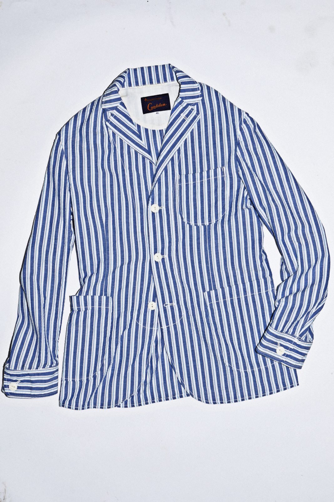 アイビースタイルをテーマにしたストライプのシアサッカー生地は、汗をかいてもべたつきにくい吸水速乾性を備え、まだまだ厳しい残暑の夏にもぴったり! 加えて、フロントと袖口の猫目ボタン、脇のつなぎ目にはパイピングが施され、バックスタイルはエレガントなノーベントと、テイラー志向のカンディデュームらしい本格派仕様が見てとれます。