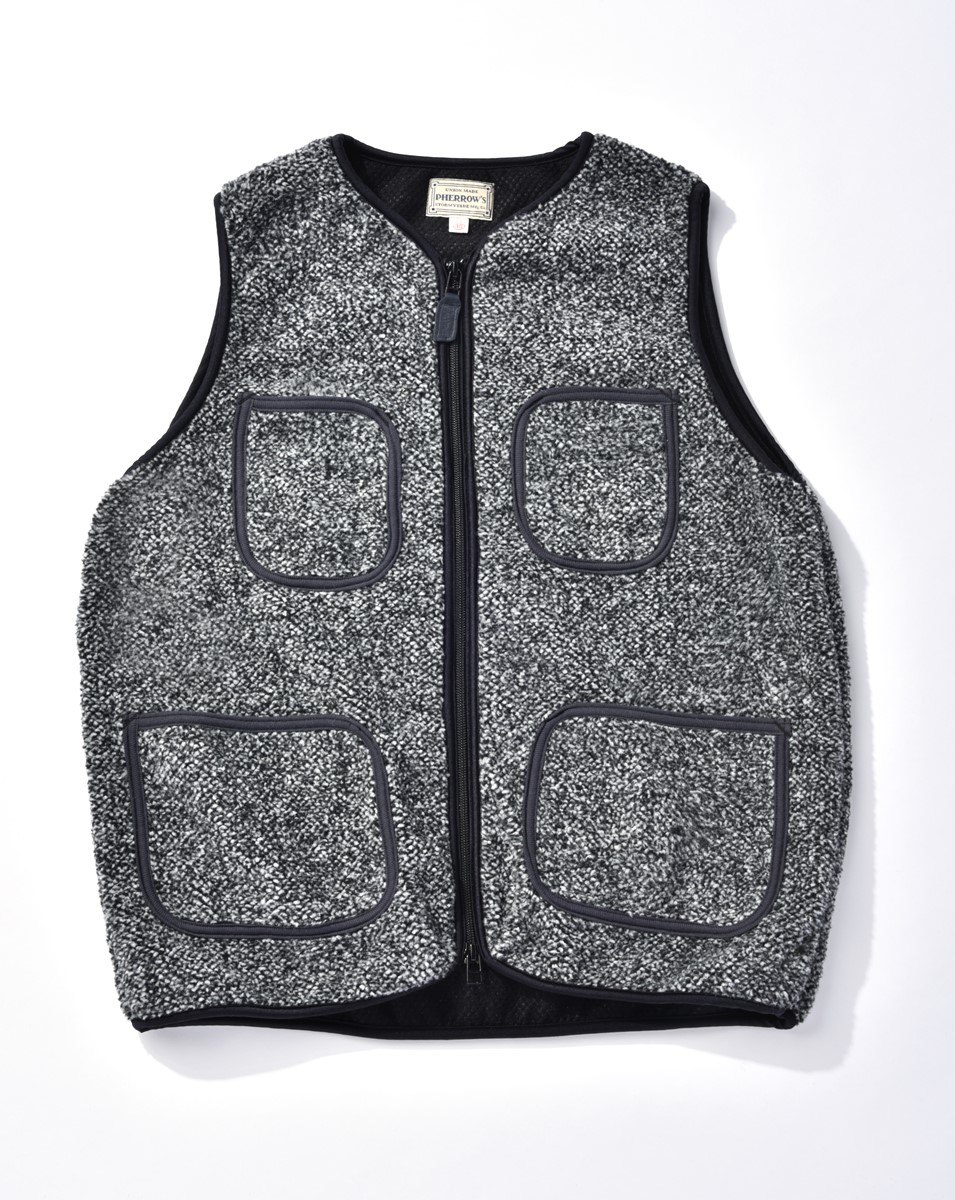 カラバリとしてナチュラルやブラウンもあるが、この色だと、いわゆるゴマ塩ベストの見映え。もちろんアクリルパイル素材だから軽くて温かい。2万3000円+税(フェローズ☎03-5725-9577)