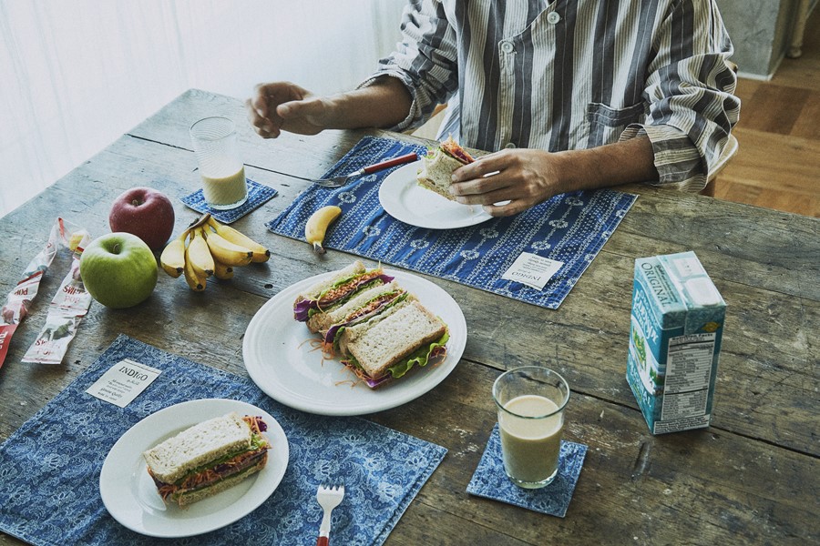 旧式力織機で織り上げたインディゴのセルヴィッジ生地は洗い加工で奥行きのある色合い。伝統的な抜染手法で“キャリコ”と呼ばれる花柄を施した。プレイスマット各1980円、コースター各550円