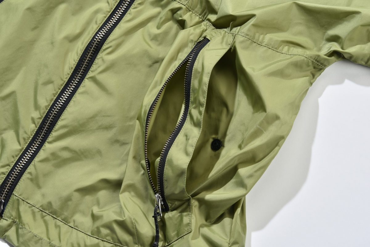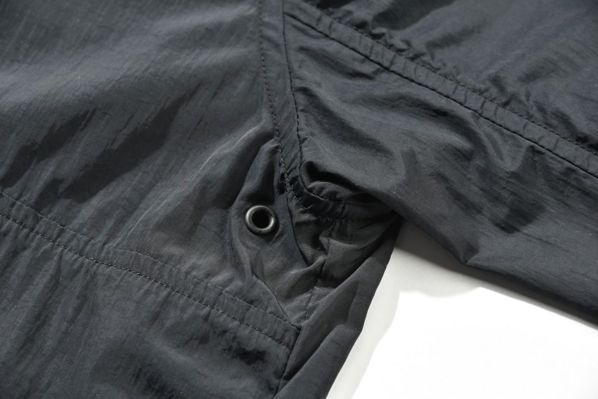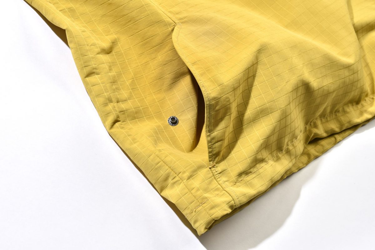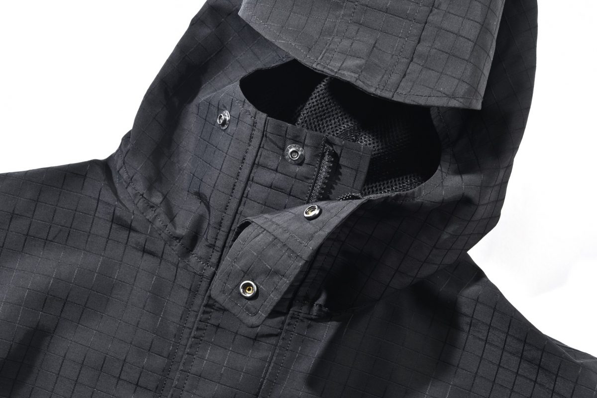 ʼ80~90年代に使用していたビッグリップストップを採用。通常のリップストップに比べ、ひとつひとつの格子が大きく、絶妙なニュアンスを生む。もちろん高い撥水性と強度を備える。さらに、ボタンを閉めてフードをかぶれば、深く顔を覆うことができ、防寒性に優れている。アウトドアをルーツに持つブランドならでは。