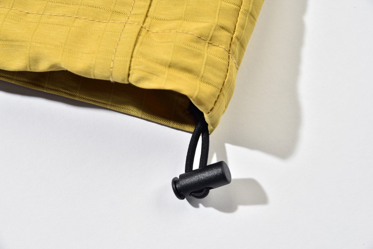 風を通しにくい袖のリブ仕様と合わせて、より防風性を高める役割を果たすドローコード。シルエットの調整にも。