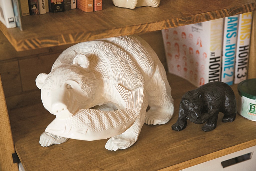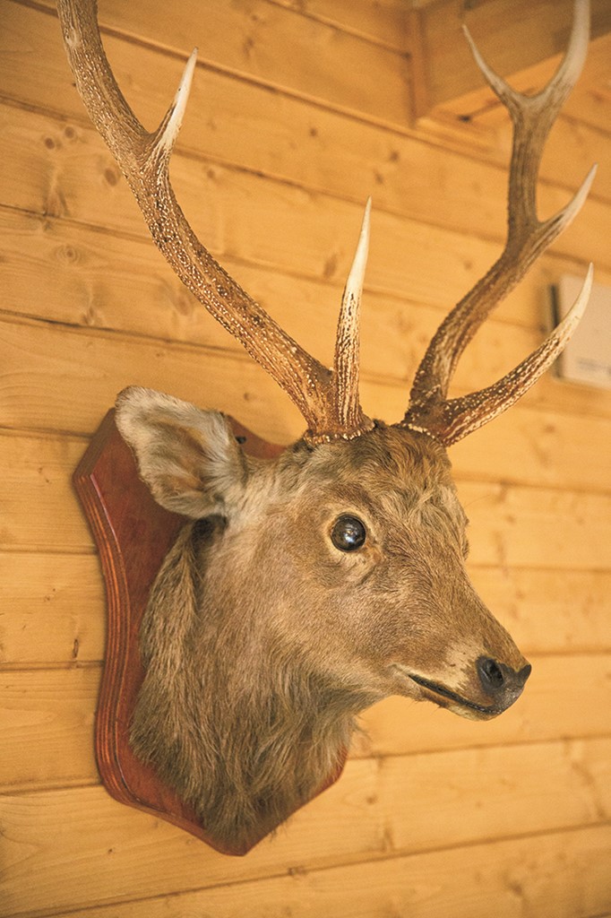 注目すべきアイデアは広大なリビングの土間。土足での活動範囲が広がり、内と外が曖昧でより開放的になった。リビングの中央に鹿。壁の色に馴染んでいるからさして目立たないが、自宅にどーんと剥製とは、さすがというか何というか。「実はネットで見つけたんですよ。こういうのBESSの家でないと置けないでしょ」