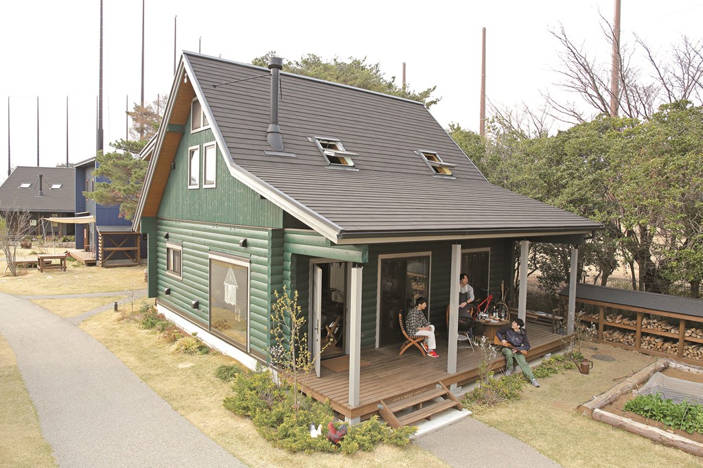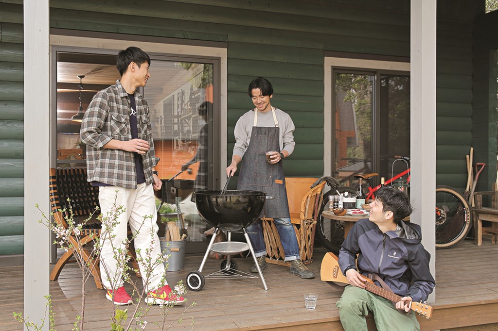 どう使おうか、創造力を掻き立てる広いウッドデッキが特徴のカントリーログ。今回の3人のように仲間と集まってBBQをしたり、屋根があるので急な雨の心配もいらない。