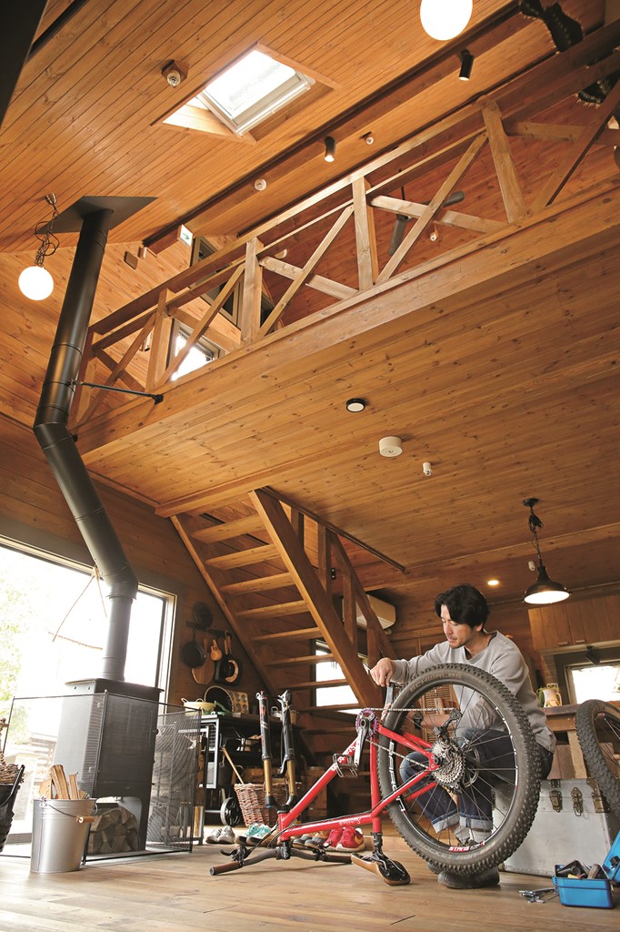 家の常識を覆すフローリングの土間と、その上に広がる無垢の木材で囲まれた大空間もカントリーログの特徴。「ここならバイクを数台置いてもぜんぜん余裕」とほころぶ小林さんだが、家族に向けてそのわがままをいかに押し出すかも、趣味人として試されるポイントになる。