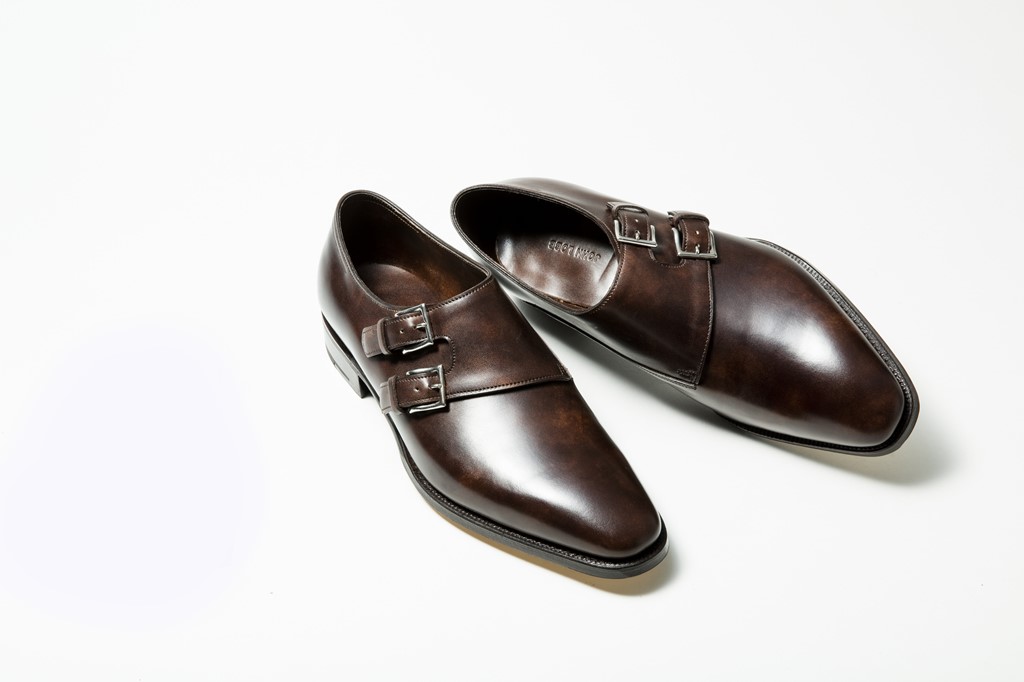 1枚革から作られるダブルモンクストラップシューズは、包み込まれるような履き心地。スクエアトゥが美しく、ダークブラウンのミュージアムカーフが、どんな季節でも足下を洒脱に演出する。
