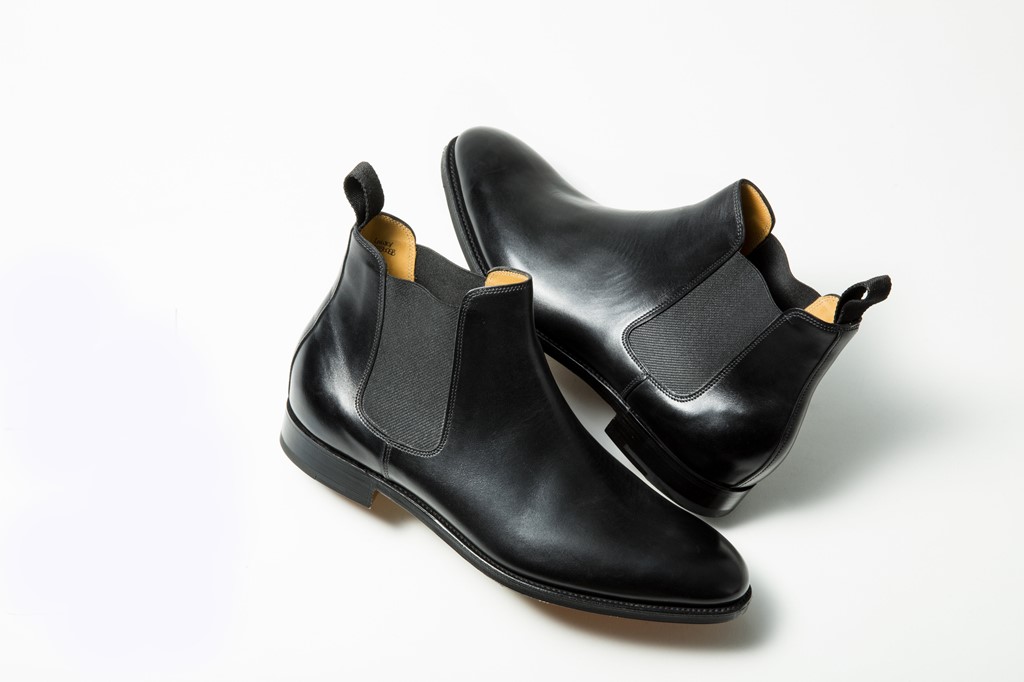8695ラストのアッパーにシングルレザーソールを配したサイドゴアブーツ。本来はカジュアルに合わせたいタイプの靴だが、最高級のカーフとハンドメイドの精巧な作りが楽しめるこちらは、エレガントな着こなしとも好相性。