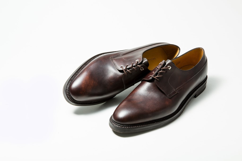 羽根から履き口に沿ったかたちで切り替えをあしらったデザイン、防水加工されたミュージアムカーフとキャビアグレインレザーのコンビネーションが特徴で、アイレットの一番上には、パラジウム製の装飾があしらわれる「BALMORAL LINE(バルモラルライン)」の名靴のひとつ。