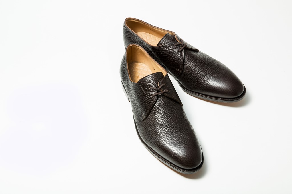 ウォータープルーフ加工されたミュージアムカーフをメイン使いして、レースステイから履き口にかけては細かい型押しが施されたキャビアグレインで切り替え。トゥキャップが上品な面持ちながら、機能性と耐久性に優れた仕上がりだ。