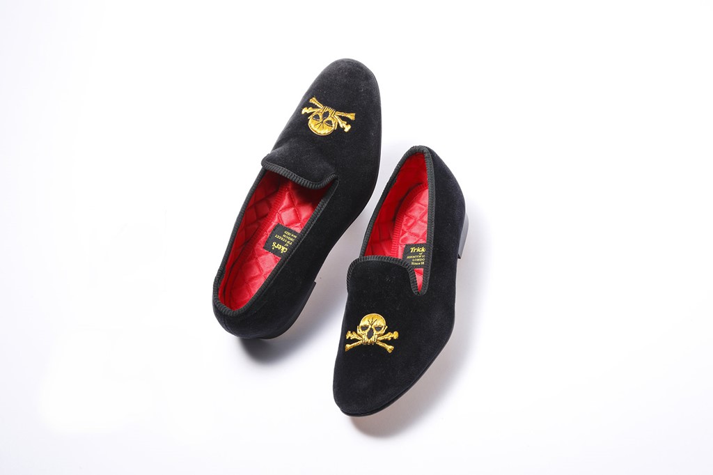 黒のベロアにスカル&クロスボーンの刺しゅうが入り、キルティングライナーの赤が刺激する。元々は貴族がカントリーハウスで室内履きするものとして、18世紀末から発売されていたという経歴を持つ品。ちなみにチャールズ皇太子が気に入り、ワラント獲得の要因となったのもルームシューズだった。Ⓐ