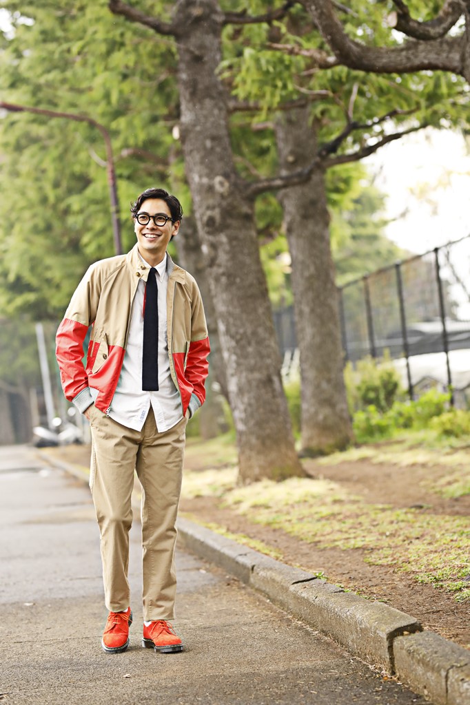 トラディショナルな組み合わせ、かつ使用している色数も少ないシンプルなコーディネイトだが、シューズとジャケットに配された淡いオレンジカラーでこんなにも春らしい印象に仕上がる。