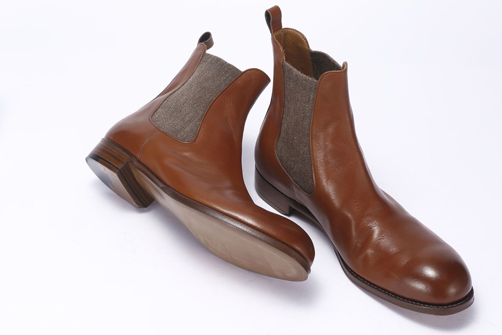 ショセのクラシックラインのサイドゴアブーツ。足首周りを細くし、甲を持ち上げているため、つま先のシルエットが生き、シルエットが美麗に見える。ゴアのフェルト調のゴムが裾から覗くとアクセントになる。