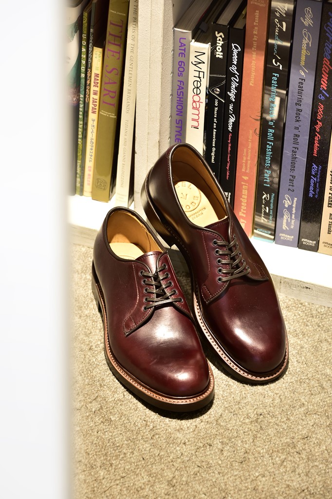 写真のPLAIN TOE BLUCHER(プレーントゥブルーチャー)はハギを入れず、贅沢にクロムエクセルを使用した1足。ラストはノーズを長く、ワイズEで考えたオリジナルで、クロムエクセルのオイリーな素材と相まって、ボリュームある靴に仕上がっている。