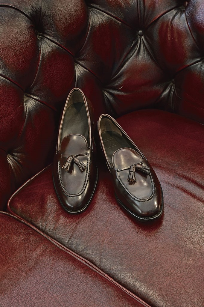 定番のひとつ写真の「キャベンディッシュ3」は、従来の木型をベースに踵周りやアーチ部分のサイズを小さくした新開発のラスト375を採用して、ホールド感を上昇させたもの。デザインアイコンのタッセルは、職人が手作りで仕上げる。