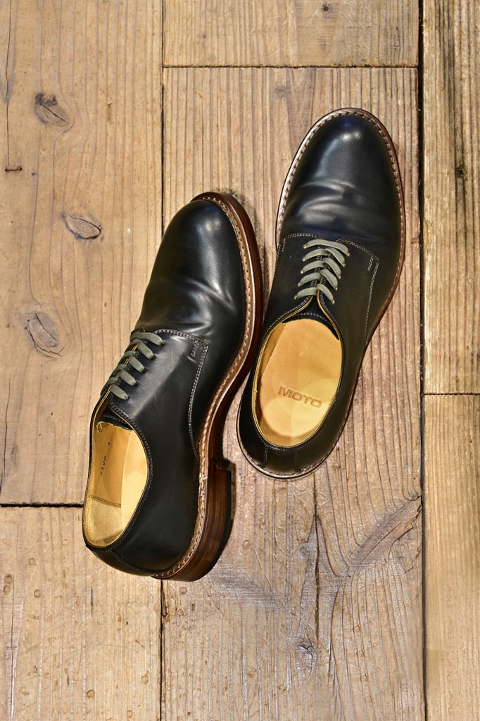 写真はコードバン プレーントゥ オックスフォードシューズ #2100。素材は、オリジナルで仕上げたコードバン。あえてグレージングという作業を省いて、素上げのままオイルを調整することでマットな質感に仕立てた。ブラックコードバンなので、仕事用の靴としても使え、グッドイヤーウェルテッド製法を採用。