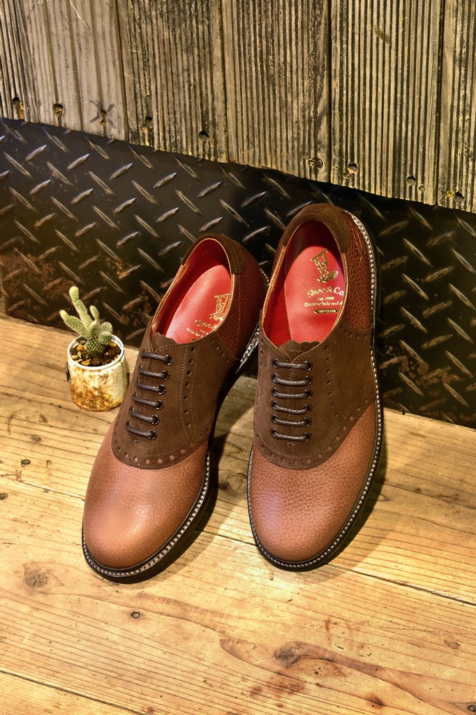写真の802S スタンダードサドルシューズはフルタンニン鞣しのエンボス革と、英国のCFステッド社製のスーパーバック素材とのコンビネーション。甲部をサドルで包んだようなこのモデルは、1960年代にアメリカのアイビーリーガーに履かれた靴で、同ブランドの代表作といえる。
