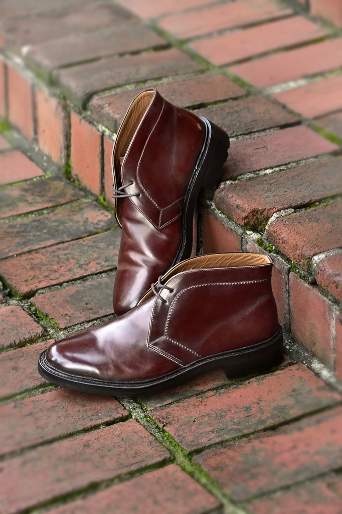 写真の「チャッカブーツ」をはじめ、パターンオーダーで素材やソールを選び、自分仕様に仕上げられるマークブーツ。こちらのモデルは、デザインやディテールはそのままに、稀少なブライドルコードバンをアッパーに使用した、イセタンメンズにラインナップしたもの。