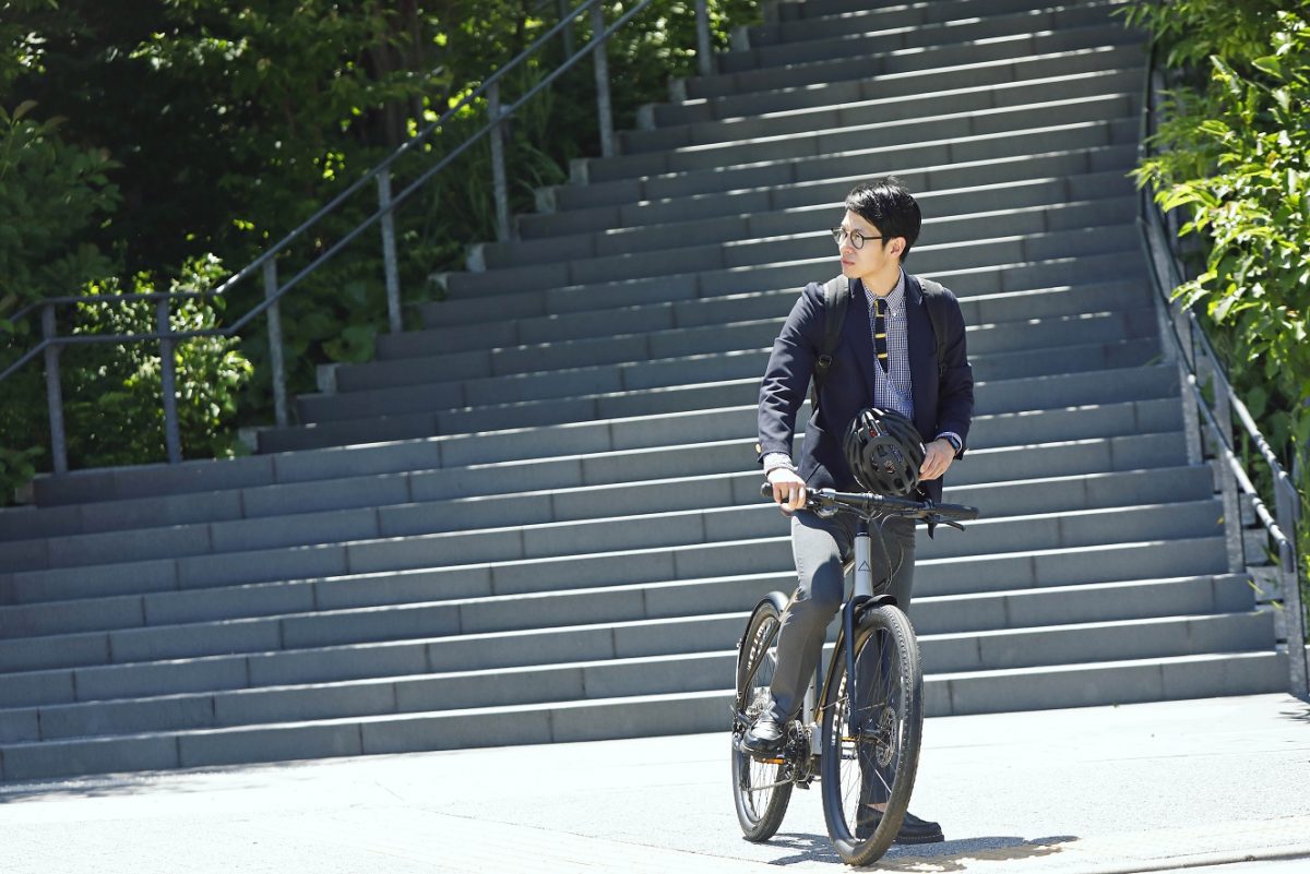 通常の一般車(シティサイクル)のように一生懸命漕がなくても、少ない力でラクに走れるのがE-BIKEの魅力。もちろん通勤時間は短縮され、渋滞に巻き込まれることもないので、朝の時間をいつも以上に有意義に使うことができるだろう。
