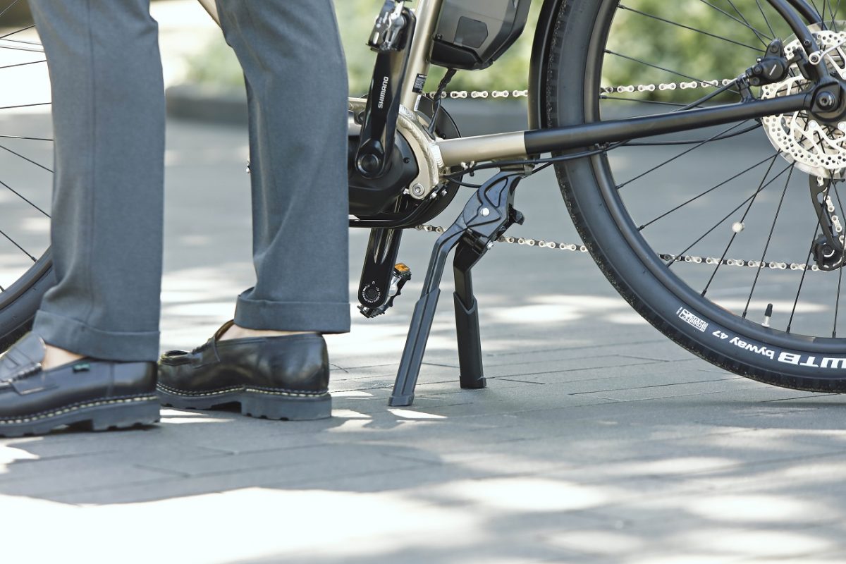 通勤時、上司から急に電話がかかってきた!なんてこともしばしば。そんな時に備え、スタンドは必須。ファーポイントなら、便利なダブルレッグスタンドも装備。片足でパン!と蹴り下ろすだけでサッと展開でき、ちょっとやそっとの風なら倒れてしまう心配もない。走行時は、スタンドの足がフレームの左側に沿うように収納され、見た目のスマートさを損なわないのもうれしい。