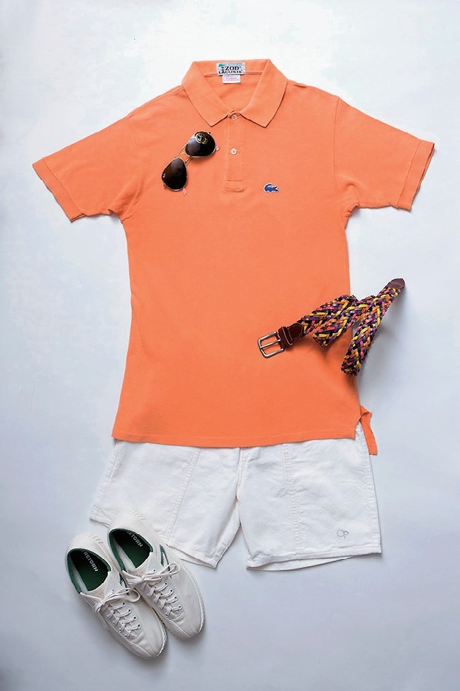 灼熱の西海岸テイストコーデが似合う。ポロシャツ/アイゾッド(私物)、ショーツ1万3200円/オーシャン・パシフィック、ベルト/アングロ(参考商品)、サングラス/レイバン(参考商品)、シューズ/トレトン(他すべてセプティズ)