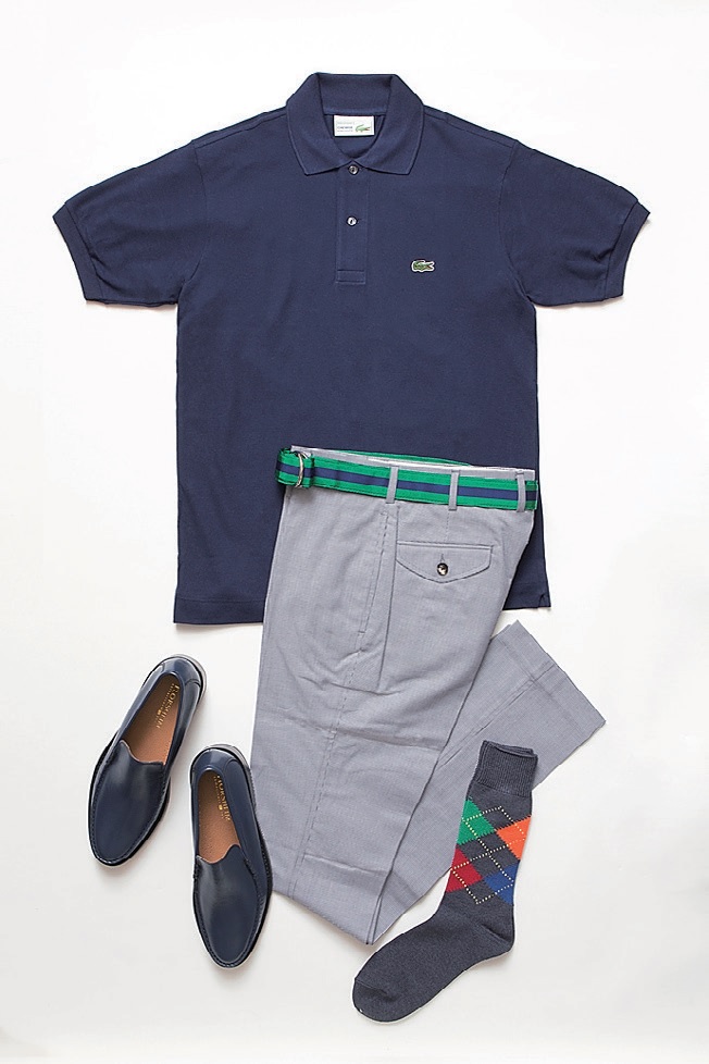 ポロシャツ/ラコステ(参考商品)、パンツ/バーンストーマー(参考商品)、ベルト6912円/バロンズハンター、ソックス1100円/ハリソン、シューズ/フローシャイム(すべてセプティズ)