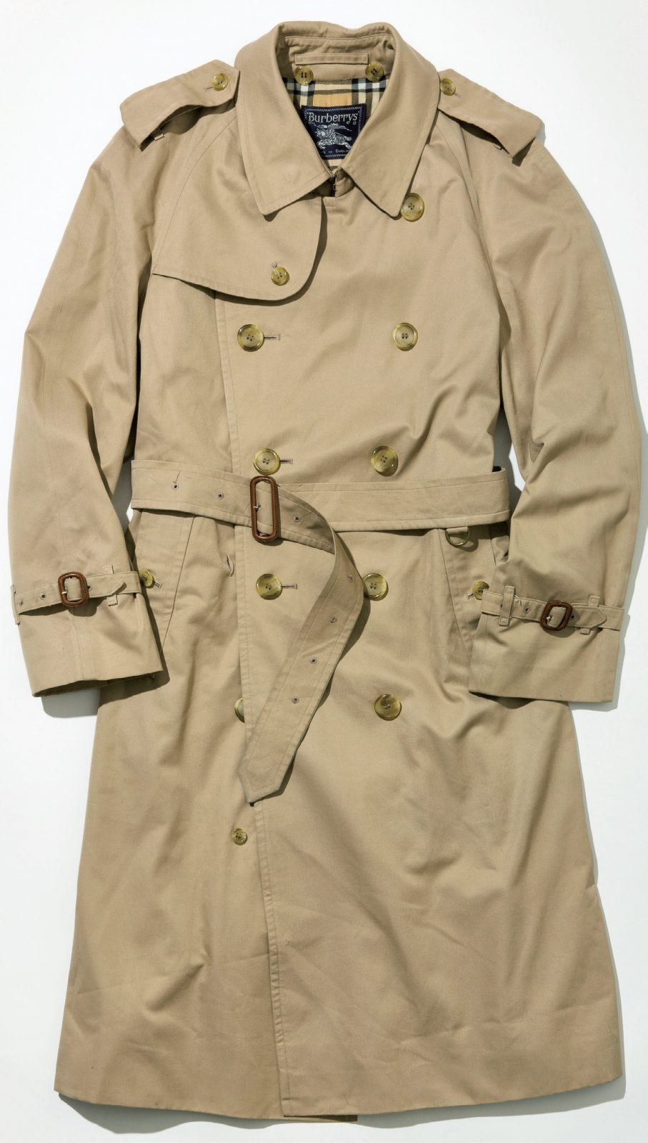 ダブルブレステッド&ベルテッドの防水素材製コート。装飾性が高いことからドレス寄りなイメージが強いが、第一次世界大戦時の英国陸軍が塹壕(トレンチ)戦で着用していたモデルが起源とされる。襟元には防塵、防寒性を高めるチンストラップや発砲時の衝撃から身を守る右肩の当て布、ガンフラップはその名残り。当時、英国のアクアスキュータム社も軍への納入をしていた。
