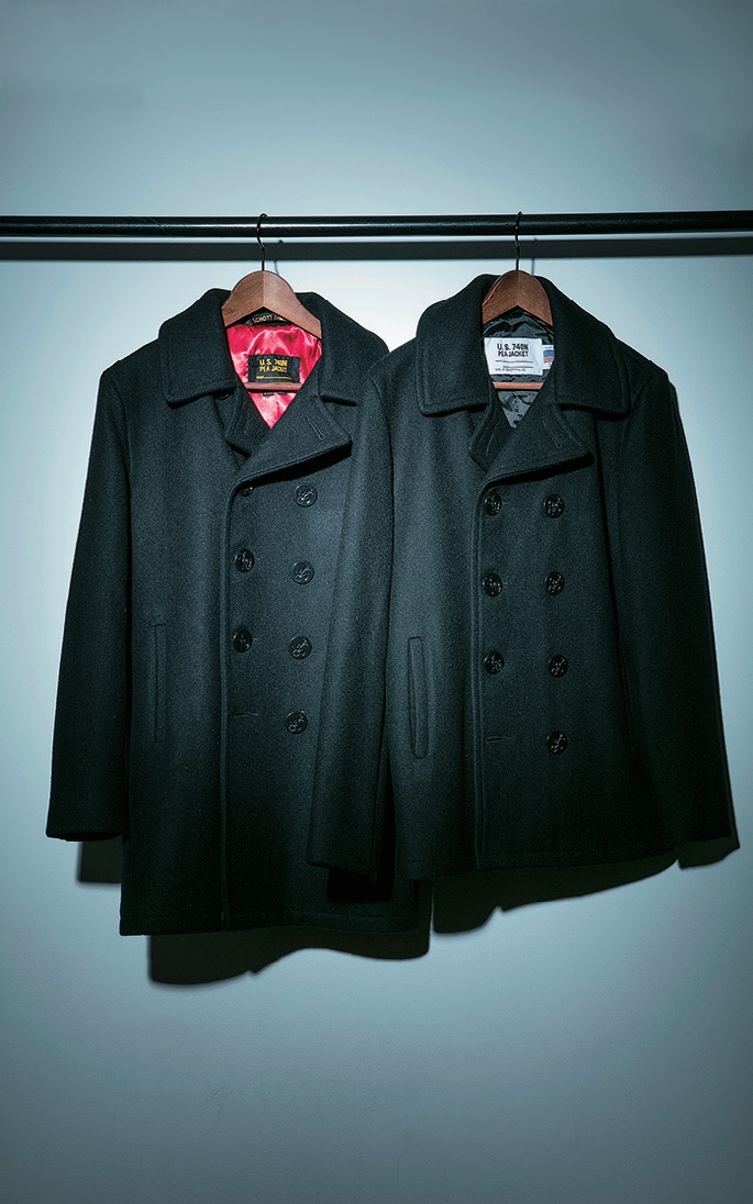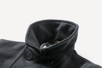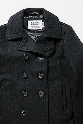 海軍で採用されていたため、海上で機能するディテールが確認できる。ピーコートは、英国ではリーファー(縮帆する人)コートとも呼ばれ、その特徴的な襟はリーファーカラーとも。
