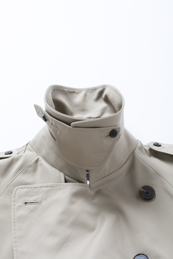 襟を立てることで、風の強い甲板の上での大きな耳の役割を持つ。コートの合わせを左右で入れ替えることができるのは、強い風の向きに対応するため。