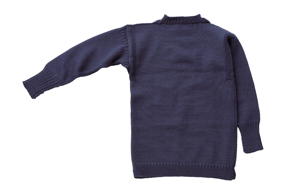 タイトなずん胴シルエット、ハイネック、裾にスリットが入る場合もあり、肩や胸にのみシンプルな編み柄が入る。柄は主に裏編みゆえに、派手な装飾はなく、色はほとんどが紺色。18~19世紀にかけて、ガンジーセーターは英国各地の漁村で盛んに編まれ、1857年にはネルソン提督が英海軍用の衣料として採用した記録も残っている。産業革命後は漁業の衰退と機械編みの発達により、衰退の傾向となった。