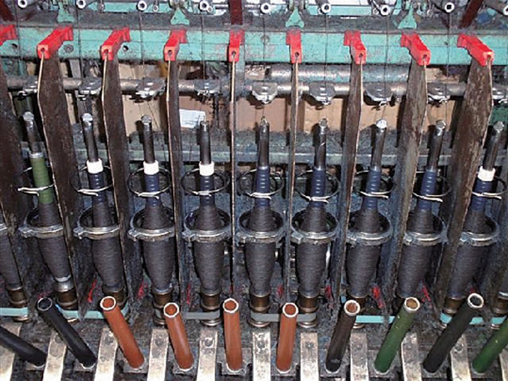 精紡機(糸を紡ぐ機械)で箸の太さほどのスライバーを糸の太さまで引き伸ばし、撚りをかけ紡ぐ。この糸を単糸と呼ぶ。