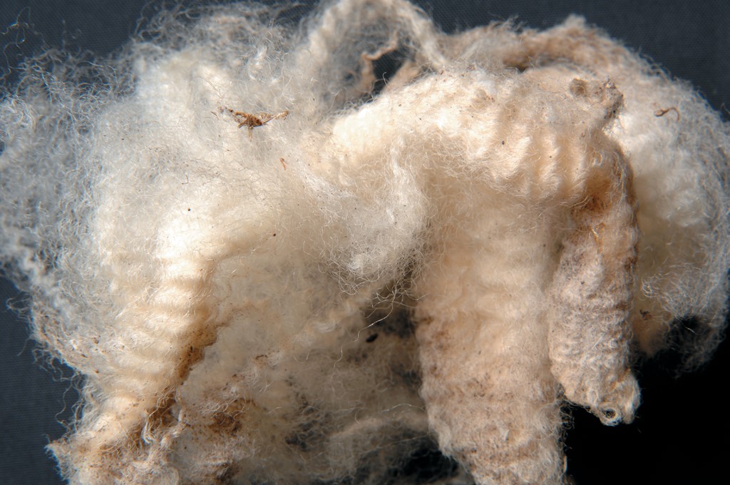 写真は取れたばかりの原毛。ここから羊毛を選別し、太さ長さの異常なものなどは取り除かれる。熟練した人の目で行う。