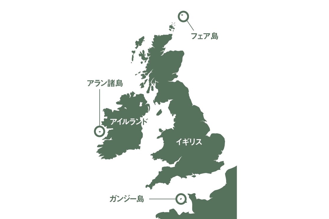 ブリテン島およびアイルランド島周辺をその起源とするフィッシャーマンセーターは大きく分けて3種。アランセーター、フェアアイルセーター、そしてチャネル諸島・ガンジー島のガンジーセーター。その基礎はガンジーセーターとされている。位置関係は上の通りだ。それぞれのニットの特徴を追ってみよう。