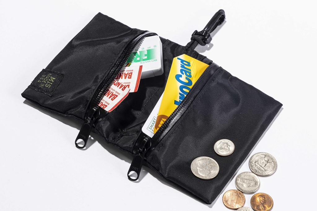[ダブルスモールポーチ]の使い方は人によって様々。クレジットカードや小銭、交通系ICカードなどの必需品はもちろん、もしもの時のための口臭対策タブレットや医薬品まで。ふたつの収納スペースがあるため、役割によって入れるものを小分けにできるのも嬉しいポイント。中心部で折りたたんでベルクロで着脱できる仕様になっており、止水ジップを採用しているので多少の雨ならジップ面からの浸水を心配する必要もなさそうだ。折りたたみ時のサイズ、W12.5 cm× H10cm。7590円