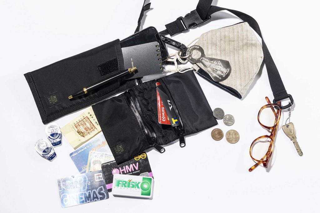 あと特筆すべきは、[アイウエアソフトケース]にスマートフォンのみならず、アイデアや取材内容を書き留めておくためのノートやペンを入れている点ですかね。とにかく荷物を絞れないボクの性格が出ている。このようにユーザーの個性を感じられるのも、このアイテムのおもしろいところだと感じました」。