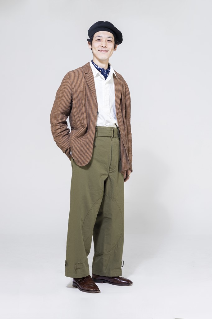 「来春をイメージしてリネンJKT 洗いざらしのシャツ、小物もベレー帽とスカーフでとことんヨーロッパにしました! 裾から覗くウイングチップがミソ!」。(174㎝ 54㎏、Lサイズ着用)