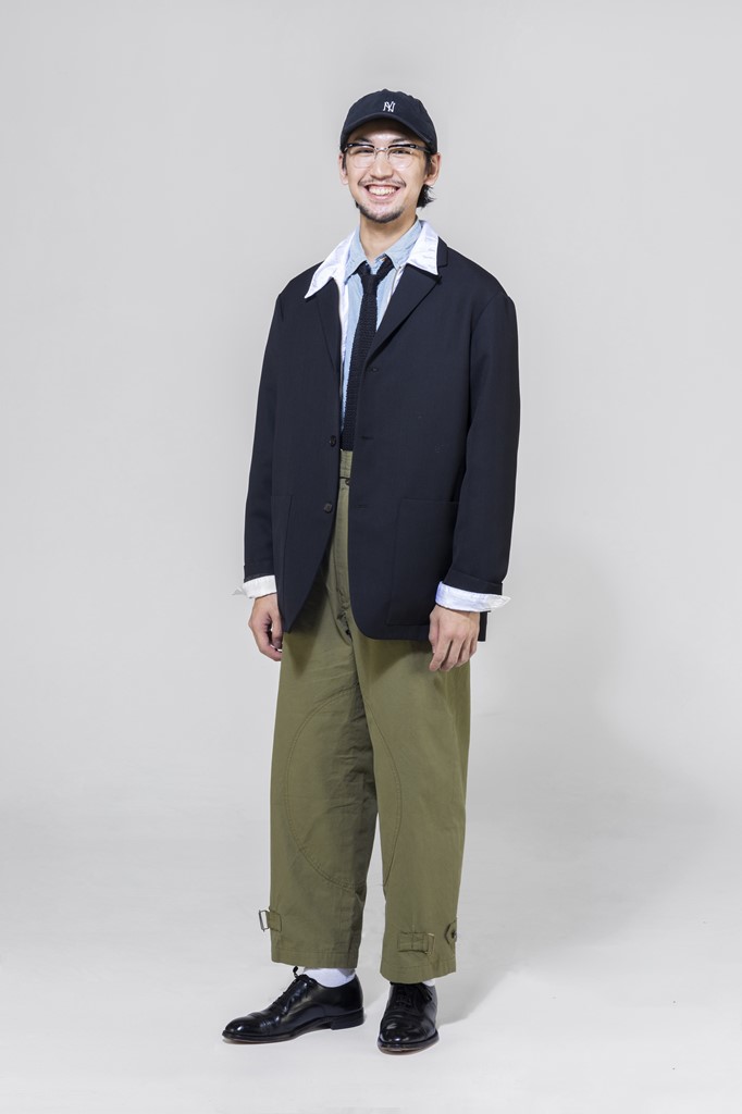 「3つボタンのテーラードジャケットにタイドアップで崩したアメトラミックスコーデ。タイまでタックインしてウエストベルトを強調しました」。(178㎝ 70㎏、Lサイズ着用)