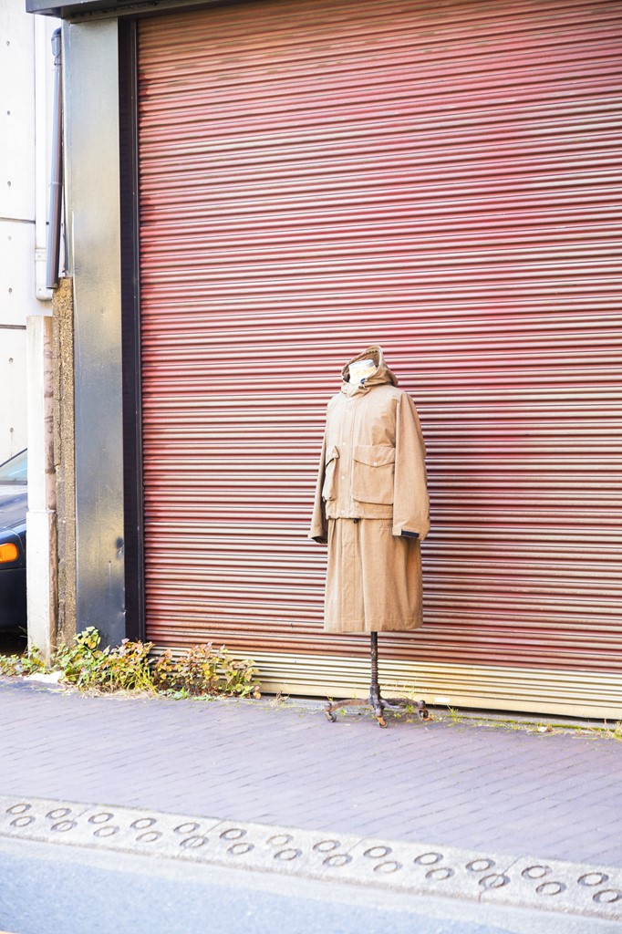 上に重なるショートパーカには大きなフラップポケットが配され、袖のベルクロ仕様やフードと裾に施されたドローコードでヘビーデューティなアウトドアウエアの趣きも。コートはラグランスリーブ仕様に深いセンターベントが入ることでレイヤードしても野暮ったくならない、ハバーサックらしいパターンの美しさが反映されている。表地にはオリジナルのグレンチェックコットンウール素材、裏地には防風性が高く程よくストレッチの効いた帝人フロンティア社のソロテックス素材を使用しているため、クラシックな見た目ながら機能性にも抜け目がない。13万