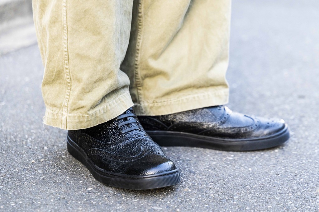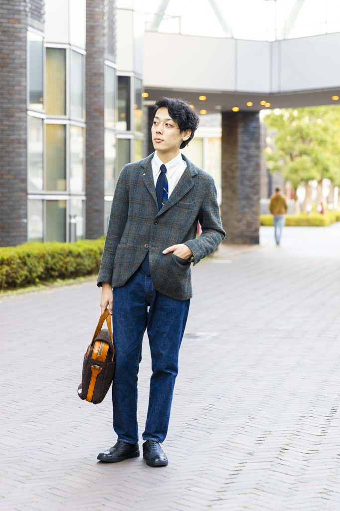 「これぐらいカジュアル寄りのドレススタイルにもお洒落に取り入れられるのは、“ドレス顔だから”というだけでなく、逆にほどよいカジュアルさも持ち合わせているからだと感じました。もちろんスーツスタイルでもまったく違和感なく履けそうですね。あと、これで30分ほど歩いてみたんですけど、いい意味で足元に気を遣っている感覚が一切ない。一般的な革靴を履くことの多いボクにとっては新鮮ですし、外回りが多い日にはめちゃくちゃ重宝しそうです」