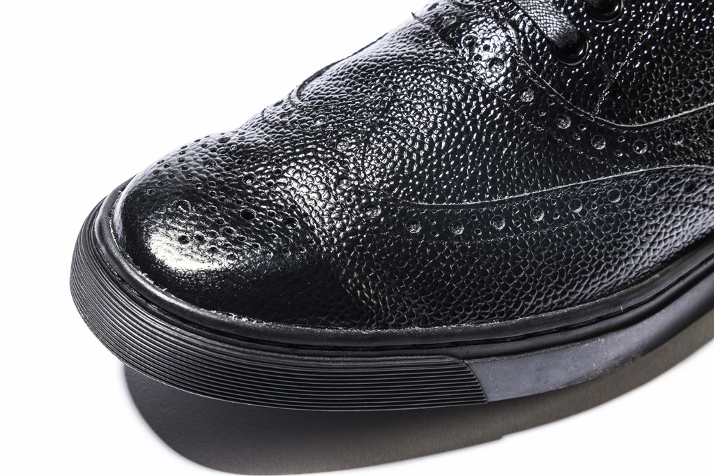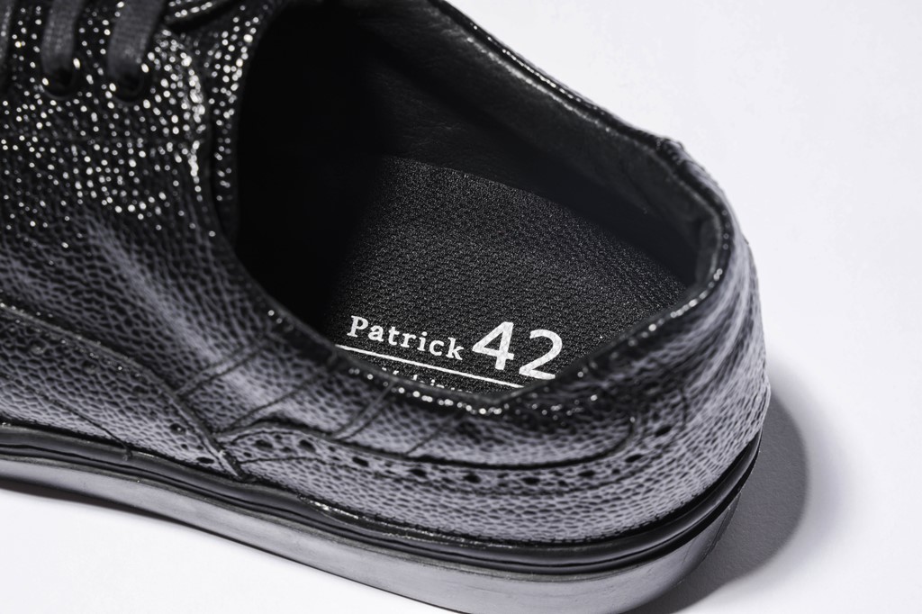 型押ししたステアレザーにウレタンコーティングを施すことで光沢感アップ。さらに、ほかのパトリックのモデルに比べるとノーズが長く設定されているため、よりドレッシーな印象に仕上がっている。型押しの方がプレーンレザーより汚れが目立たない、という隠れた利点も。