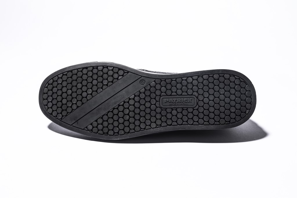 グリップ力の高いアウトソールを採用。余計な負荷がかからず、長時間の歩行も快適に。さりげなくパトリックを象徴する二本線が入っているところがニクい。