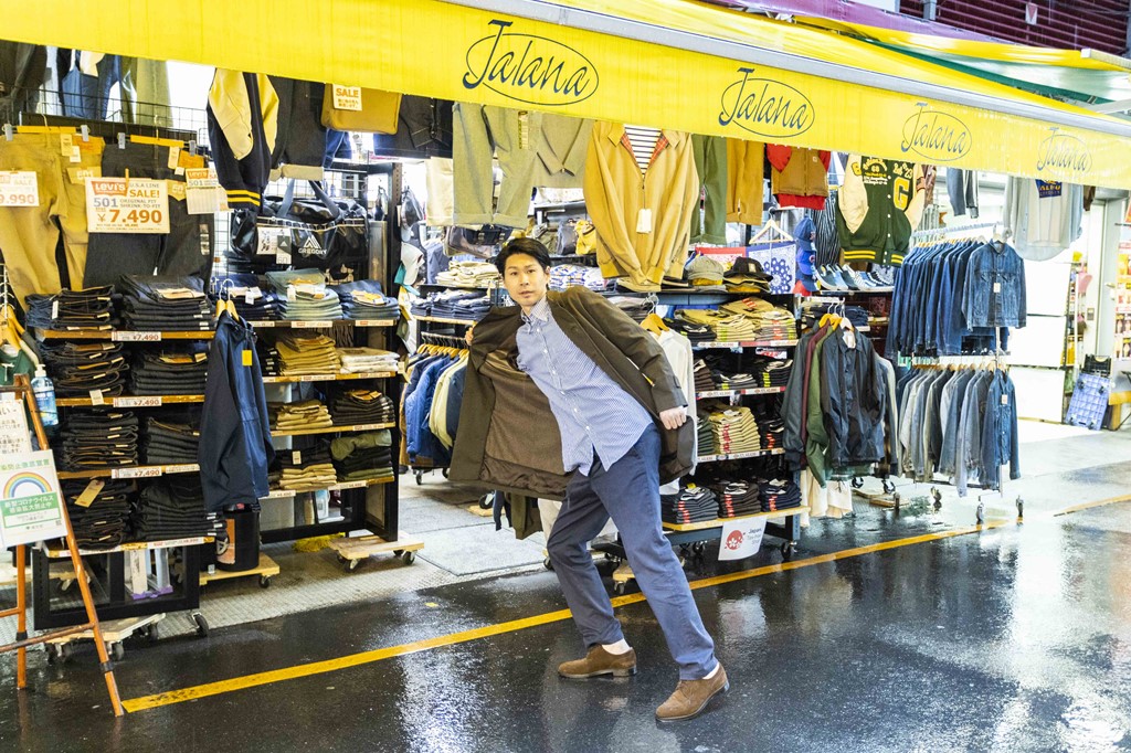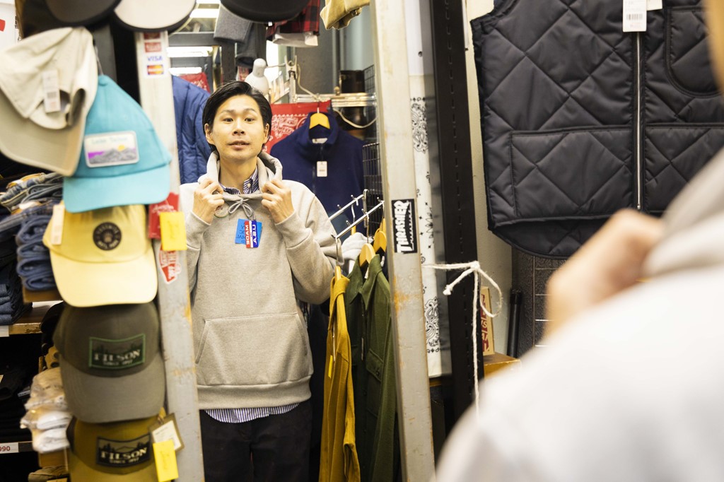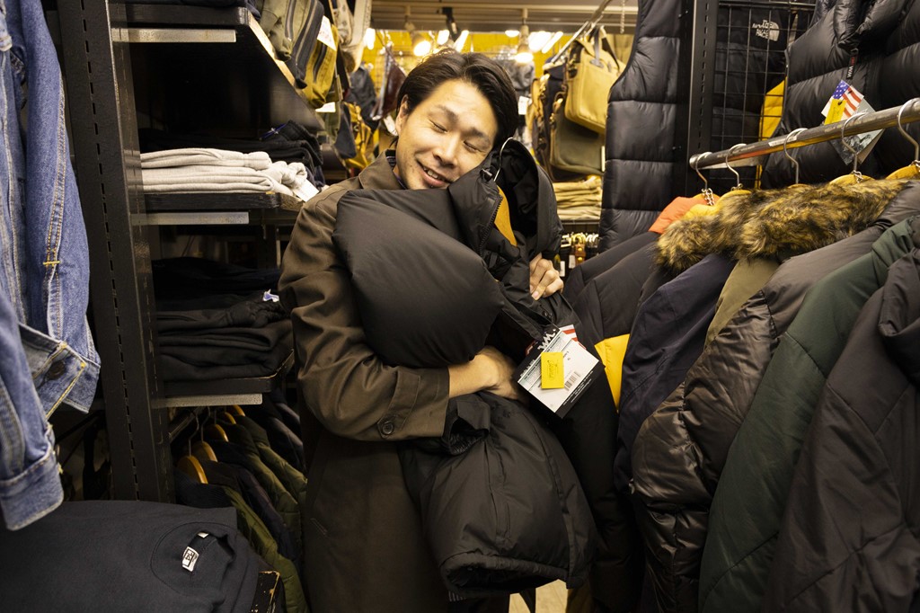 気を取りなおし、真剣な眼差しでアイテムを選び始めるチンパチ。マイナス17度までの環境における着用を想定した、冷蔵庫作業員も愛用するサムコフリーザーウエアのクーラージャケットに興味津々!